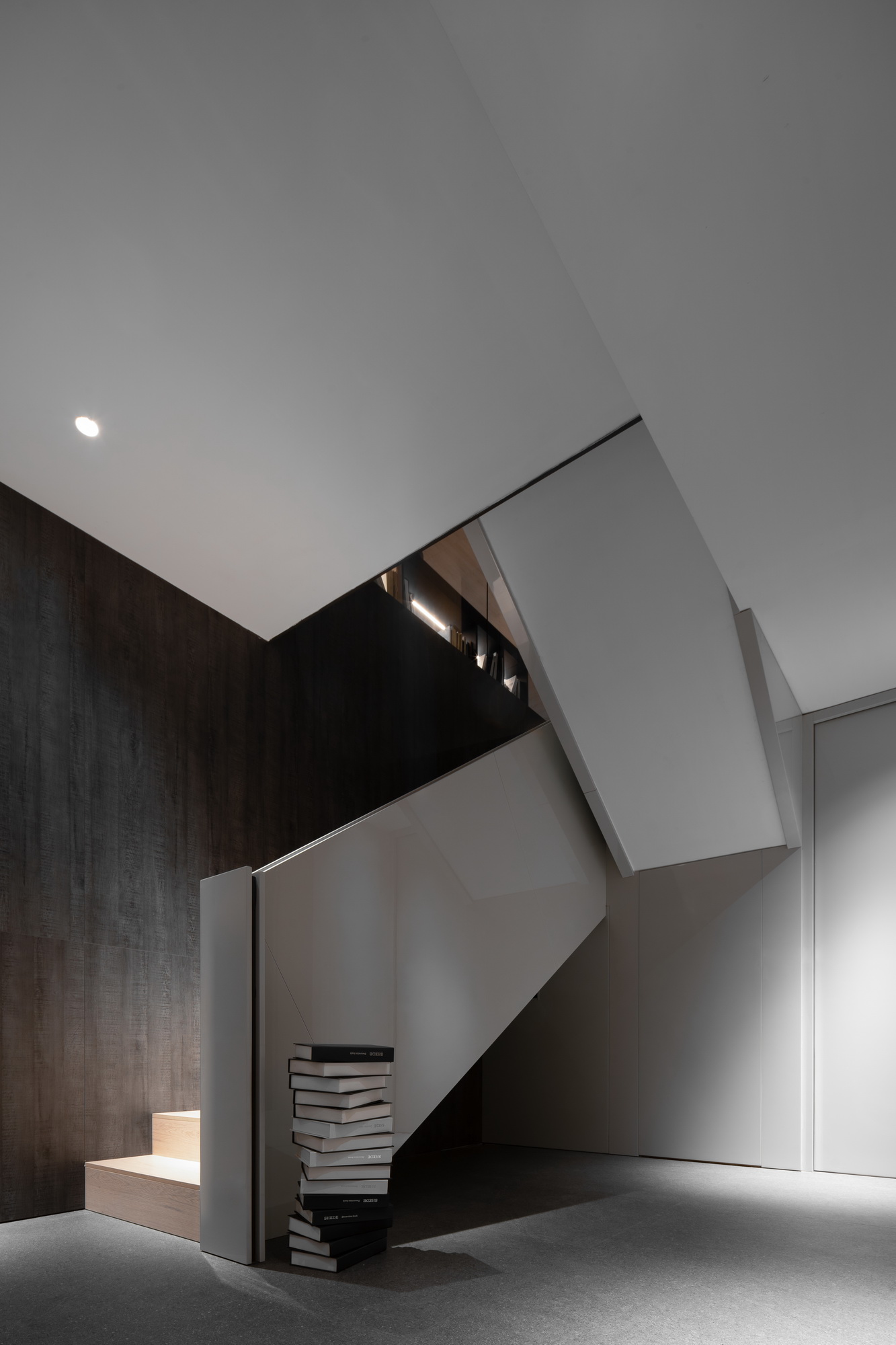 等线切割亮光涂饰的方块,体块组合间错落的谋求对建筑关系的理性向往。俯仰之间,便将立体元素从一个平面中破坏分离开来,