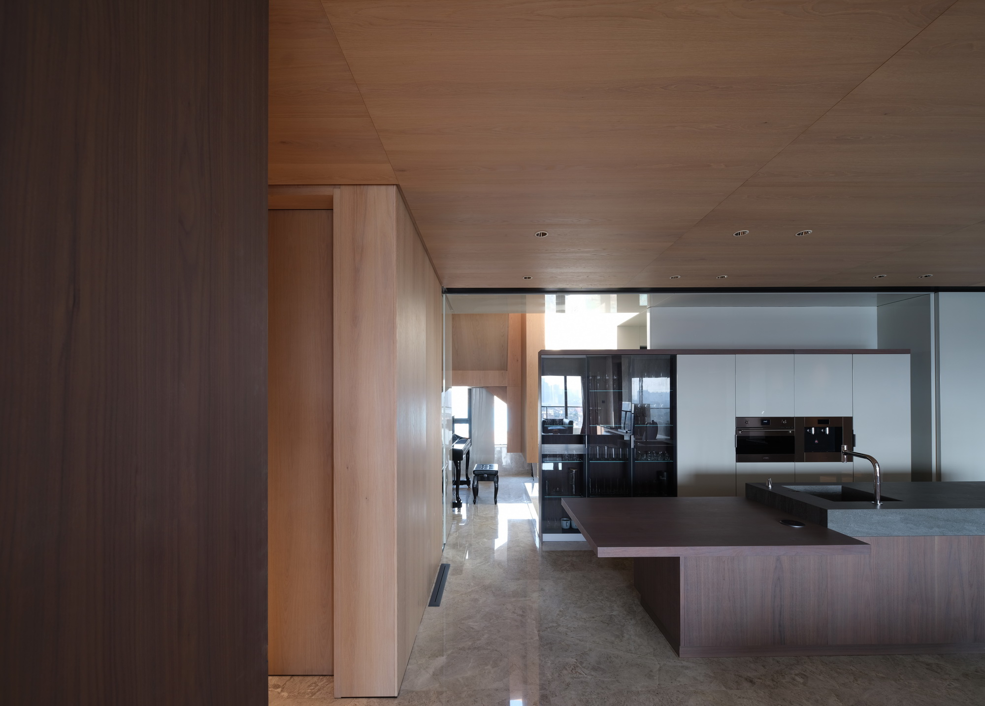 案例材料白橡木皮、胡桃木木皮、亮光/哑光烤漆、玻璃隔断